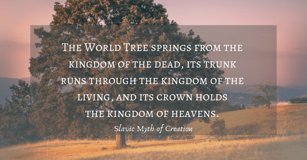 Since before his arrival, everything was one, Rod separated the light from the dark, the truth from the lie, the good from the evil, and the heavens from the oceans placing the earth in-between. He created the world and the heavenly bodies from his own body: the sun is his face, the stars are his eyes, the night are his thoughts, the winds are his breath, the rain and snow are his tears, and the thunder is his voice. He created everything on earth and in the sky, and then he created other gods to keep order in his newly founded three kingdoms: the heaven, the earth, and the underworld. He also planted the seed of the World Tree, a giant oak whose roots spring from the underworld, the kingdom of the dead, whose trunk runs through the earth, the kingdom of the living, and whose crown holds and supports the skies and the heavenly kingdom.