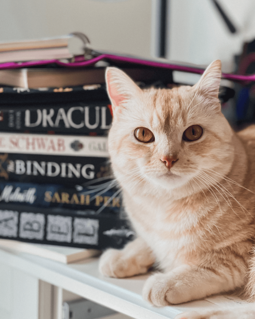 My four ginger lions were all adopted here in Dubai, starting with Ricky whom I adopted in April 2021 and since then he’s become my cream-coloured familiar. He’s occasionally grumpy, very serious about his nap times, and likes hanging around book stacks, so we get along quite well.